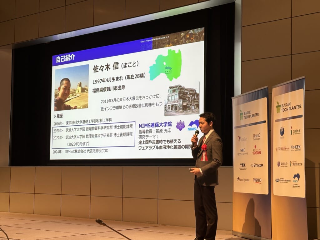 基調講演では、NIMS発ベンチャーであるSPHinX株式会社 代表取締役COO 佐々木 信 氏より「茨城から世界へ -スマートポリマーで挑むグローバルヘルス-」と題してお話しいただきました。佐々木氏は筑波大学大学院時代より、外部からの刺激(熱、光、磁場、pH等)に応答して性質を変化させる高分子材料「スマートポリマー」の研究に従事。2023年には、チーム「Smart Caxture(スマートキャクスチャー)」で第7回茨城テックプラングランプリのファイナリストとして発表し、みずほ銀行賞・グローカリンク賞を受賞しています。その後、指導教員の荏原充宏氏(NIMS)とSPHinX株式会社を創業し、博士後期課程を修了した現在も途上国や災害時の医療課題の解決を目指してフルコミットで事業化を推進しています。後援の中では、大学の研究から創業に至るまでの経緯や、現在のアフリカを中心とした感染症診断の研究/事業開発について話してもらうともに、「洗練された技術」をベースに海外に打って出て「茨城発の技術で世界を変えましょう」と熱いメッセージを伝えていただきました。